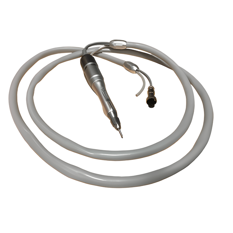 Ein komplettes Handstück mit Schraubverbindung für alle PodoMonium Sprühtechnik-Nagelfräser. Das Set enthält das Handstück, ein Easyfrog Vorderteil in Silber und ein silikonbeschichtetes Schlauchset.